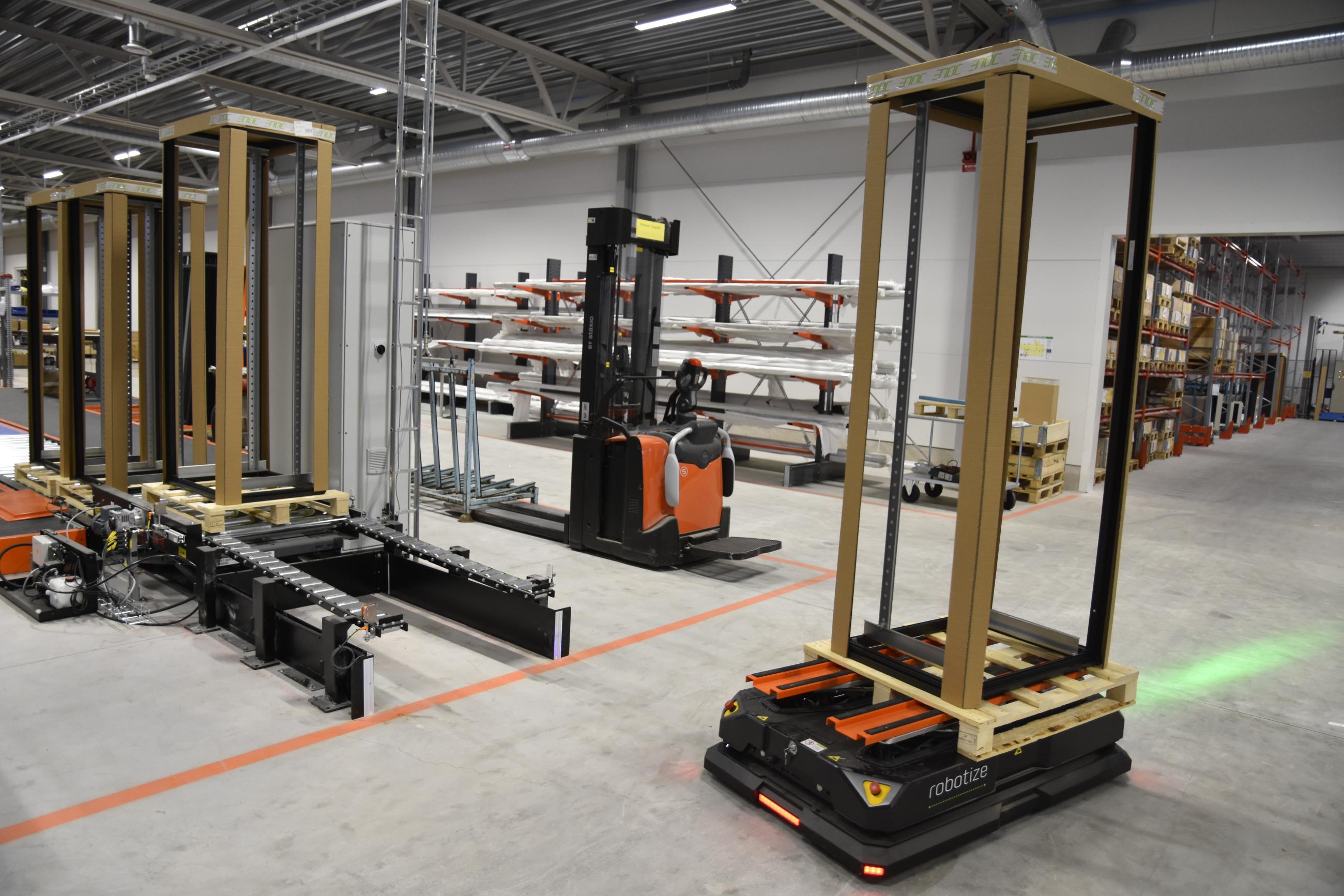 Roboten hämtar det färdigmonterade racket för transport till lager och utleverans.