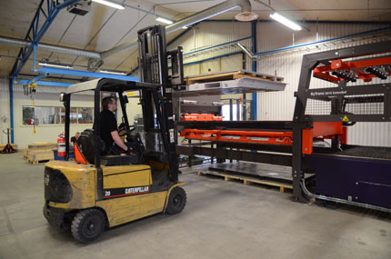 Fokus för verksamheten i Forsheda ligger på laserskärning och kantbockning, även om man har såväl excenterpressar som automatpressar i maskinparken. Här lastas plåtar in för automatisk påfyllning i den nya fiberlasern.
