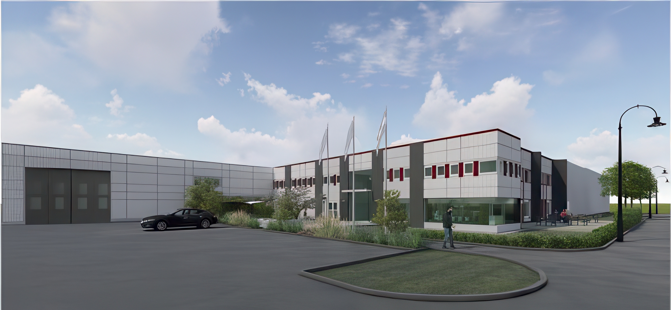 Animerad bild på hur fabriken kommer se ut efter tillbyggnad av lager och logiskanlokal samt ombyggnation av kontor.