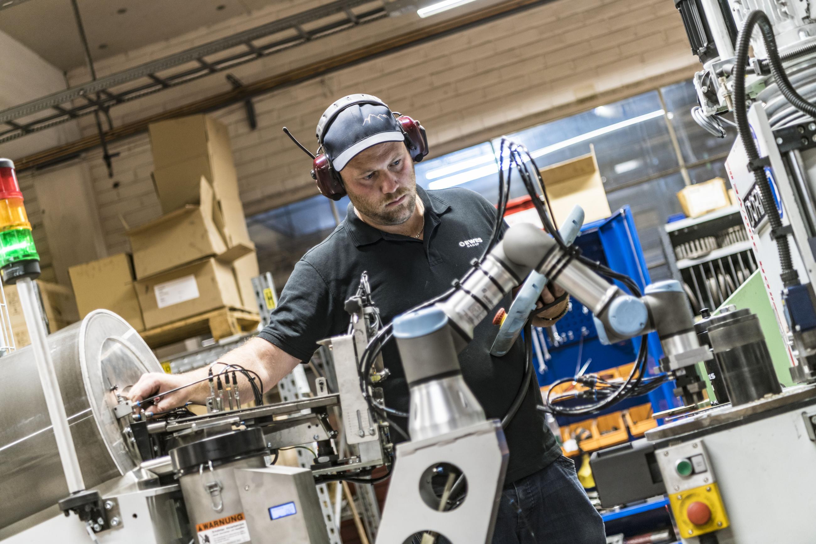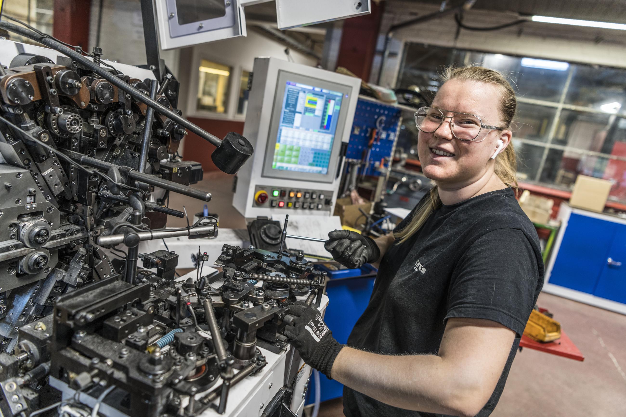 Lisa Johansson, ställare, kontrollerar en av EWES nya maskiner från Japan.