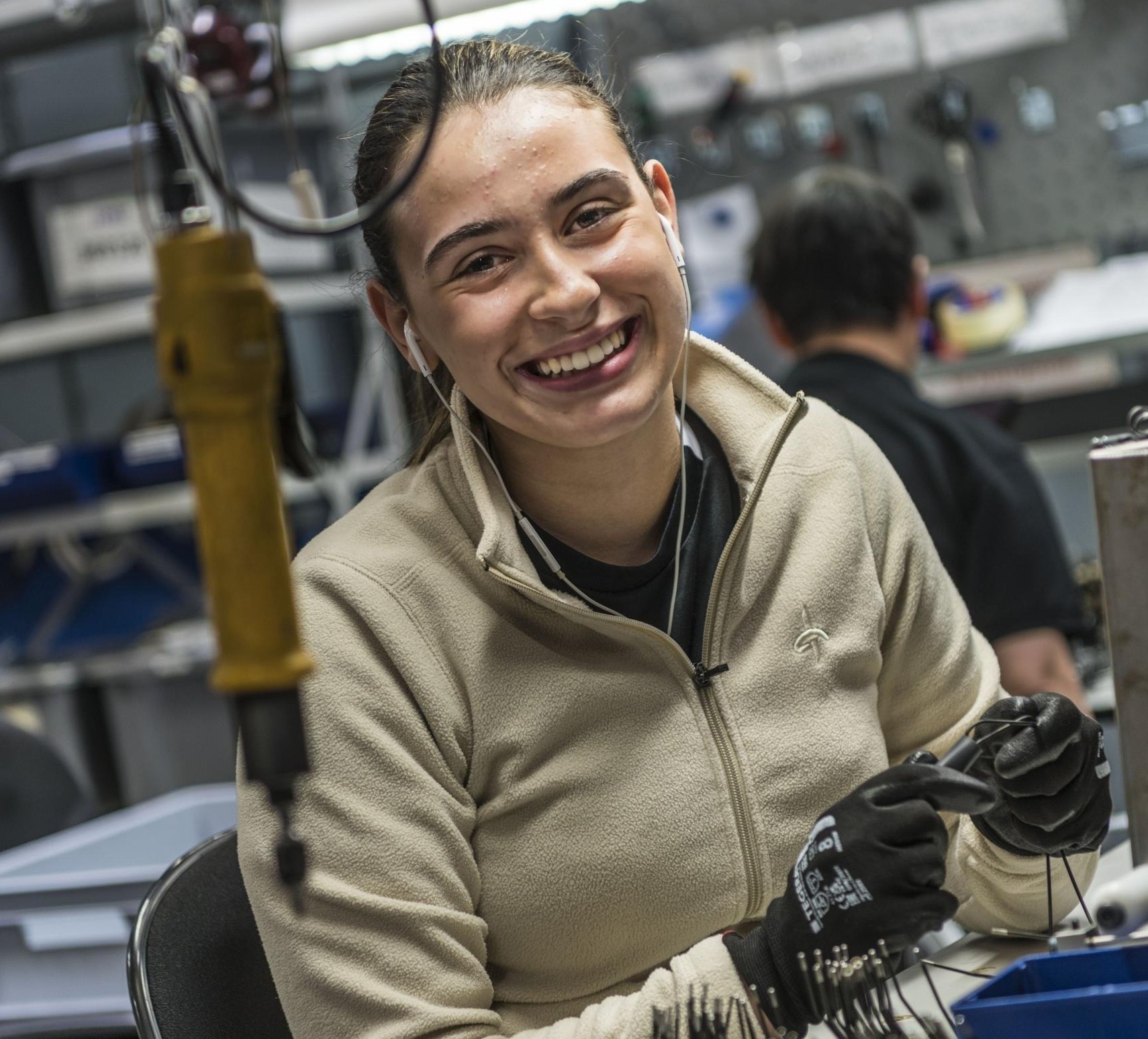 Lajla Zulovic monterar fjädrar till skyddskåpor.