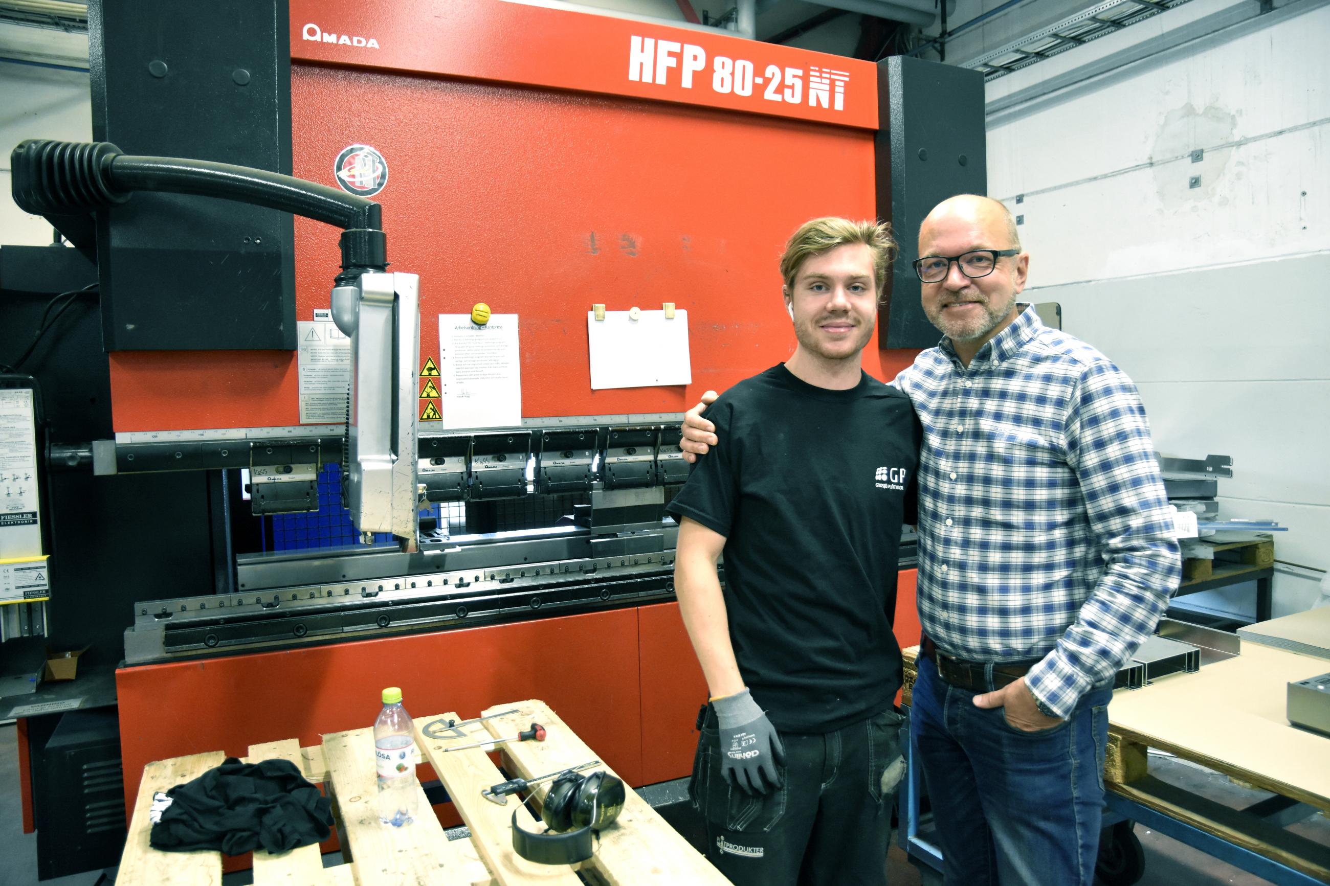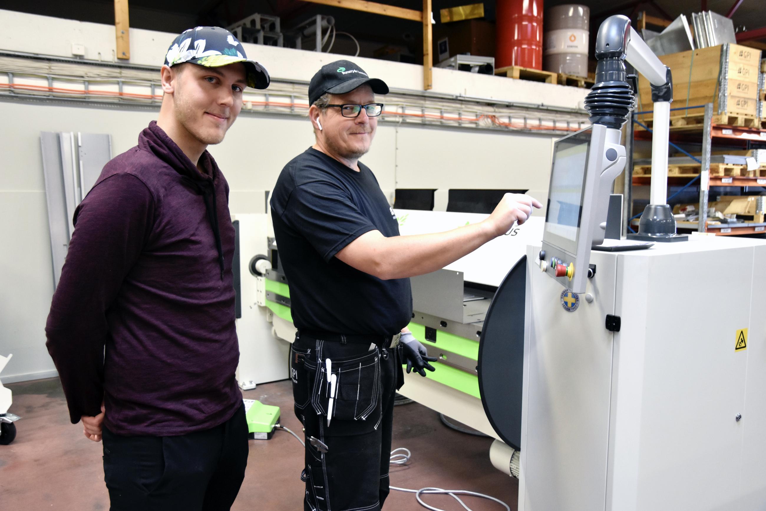 Många nyheter hos GPI. Philip Hernberg, ny produktionstekniker, och Jörg Kloppenburg, nyanställd operatör. Även vikmaskinen på bilden är ny i huset.