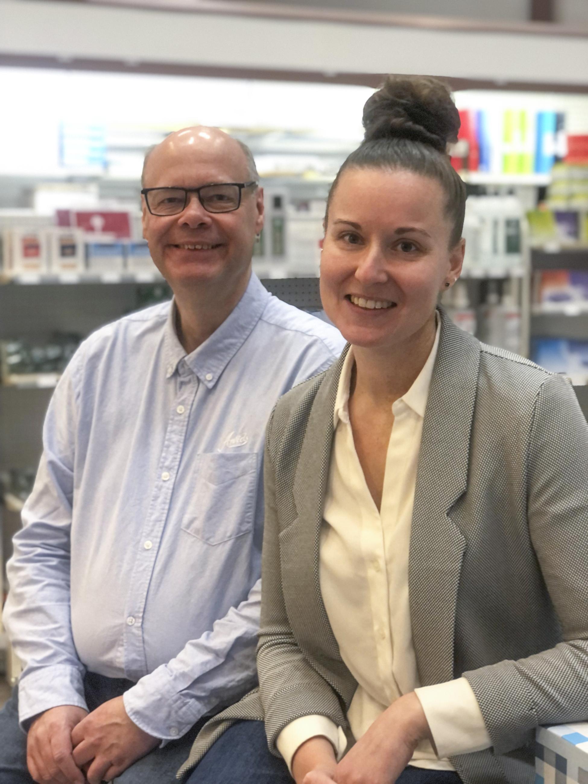 Arvids bok- och kontorscenter har på många sätt vuxit tillsammans med Anderstorp och Svante Nilsson tror att det går att växa ännu mer. ”Vi ser väldigt positivt på framtiden och kommer att både satsa på och utveckla vår kontorsförsäljning. Det finns en väldig utvecklingspotential för vårt lilla företag”, säger han. Här tillsammans med Frida Larsson som är säljare på Arvids bok- och kontorscenter.