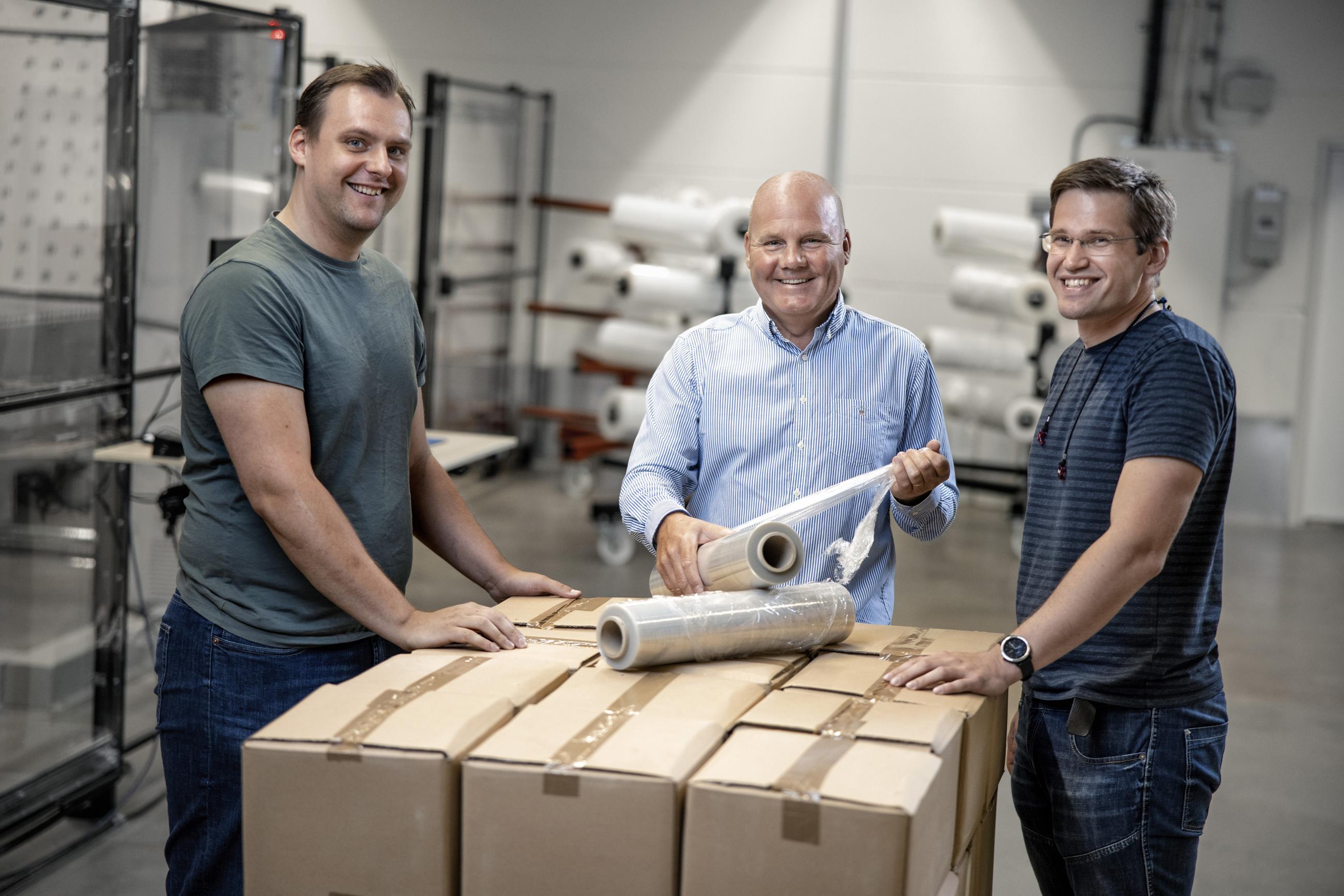 Trioplast är en av Europas ledande aktörer inom förpackningslösningar baserade på polyetenfilm, sträckfilm, industrifilm, hygienfilm och bärkassar. Här står kollegorna Robert Johansson, Thomas Johansson och Kim Andersson på Trioplast med en av många olika sträckfilmsprodukter som företaget producerar.