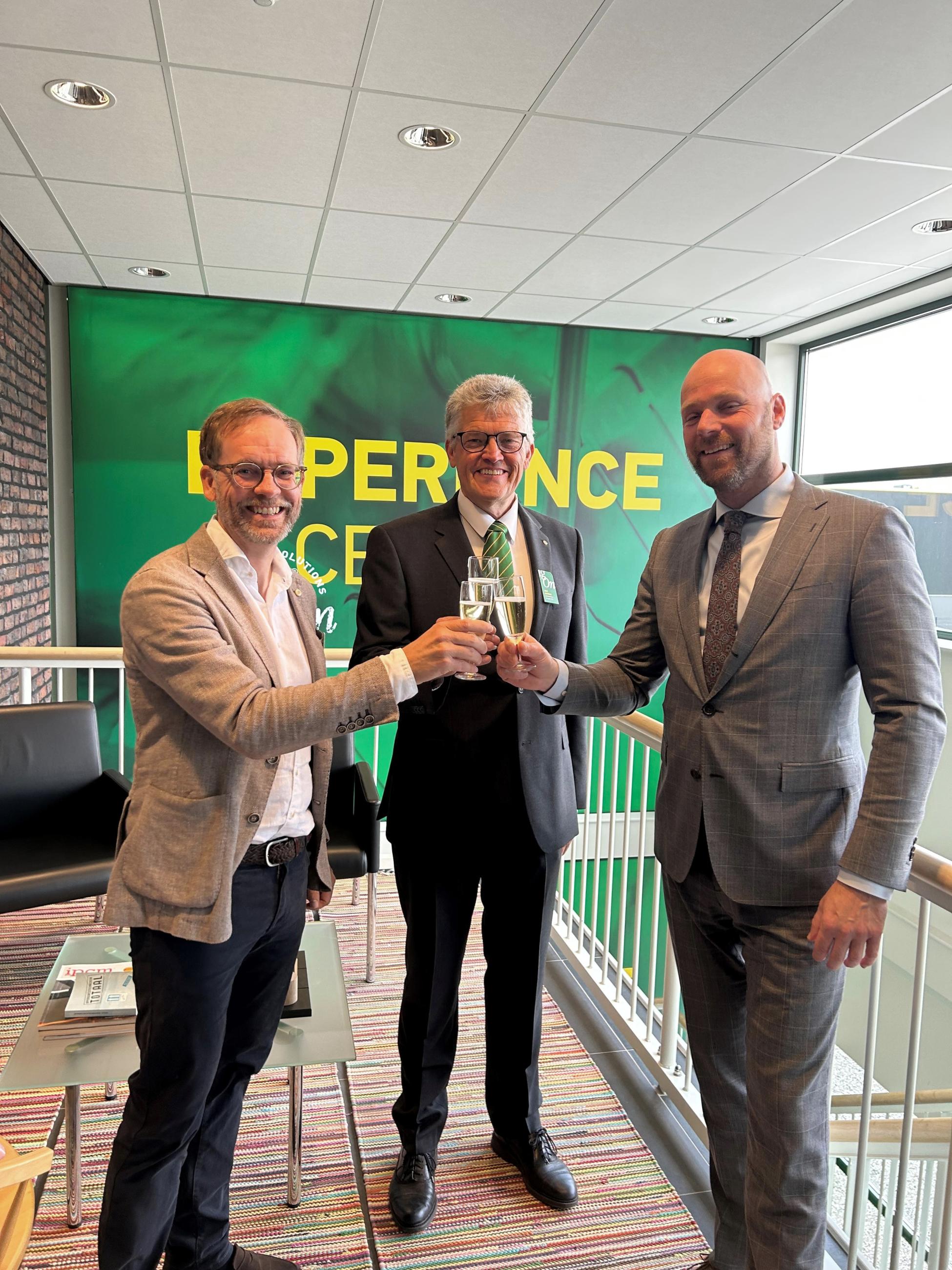 På plats vid invigningen i Horst var borgmästare Ryan Palmen (th) tillsammans med Dre Bovens (mitten), vd HangOn BV samt Petter Törefors (tv), vd HangOn AB.