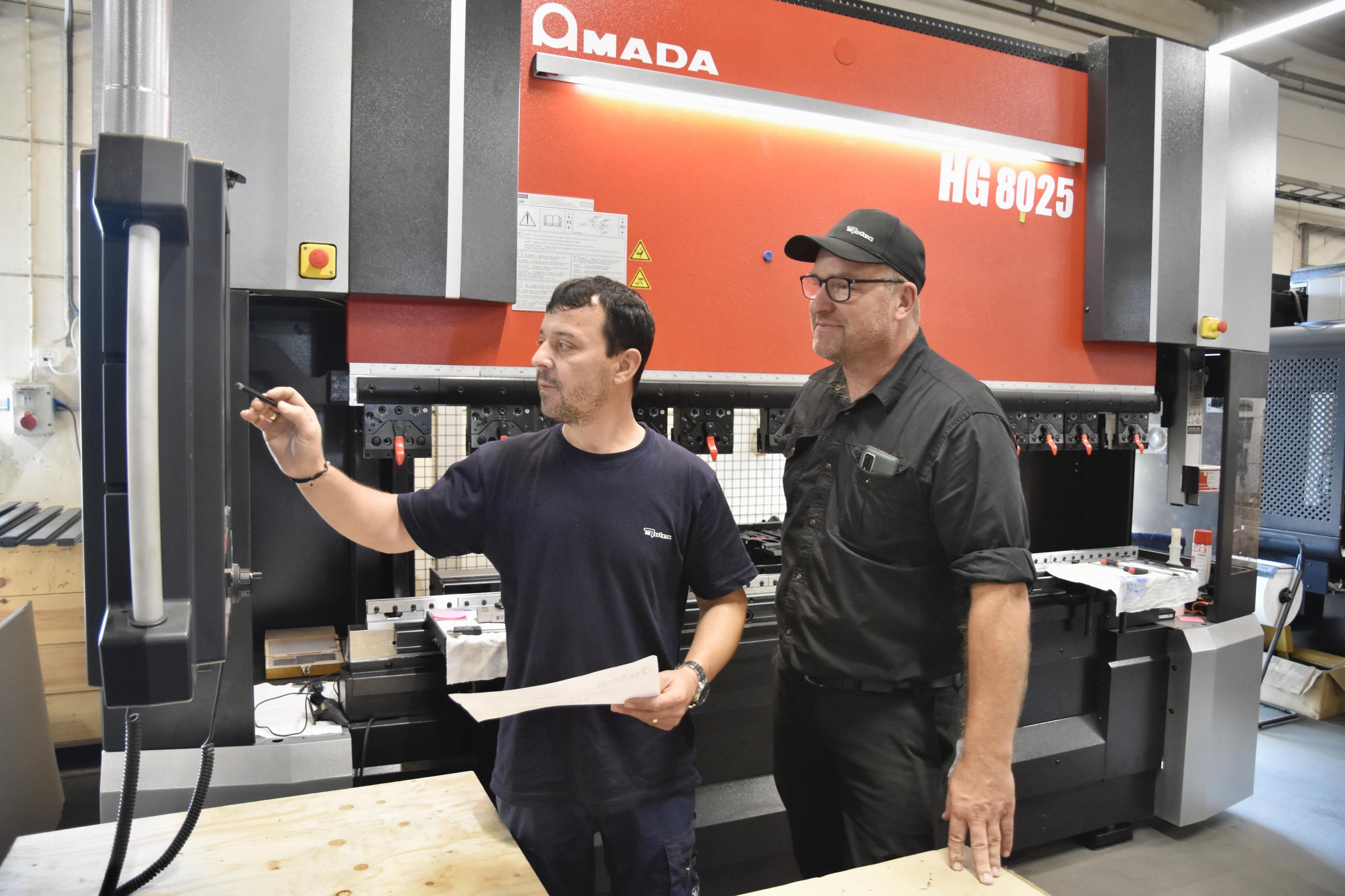 Operatören Petre Brezeanu (tv) tillsammans med Daniel Petersson, ny produktionschef, vid den nya kantpressen från Amada.
