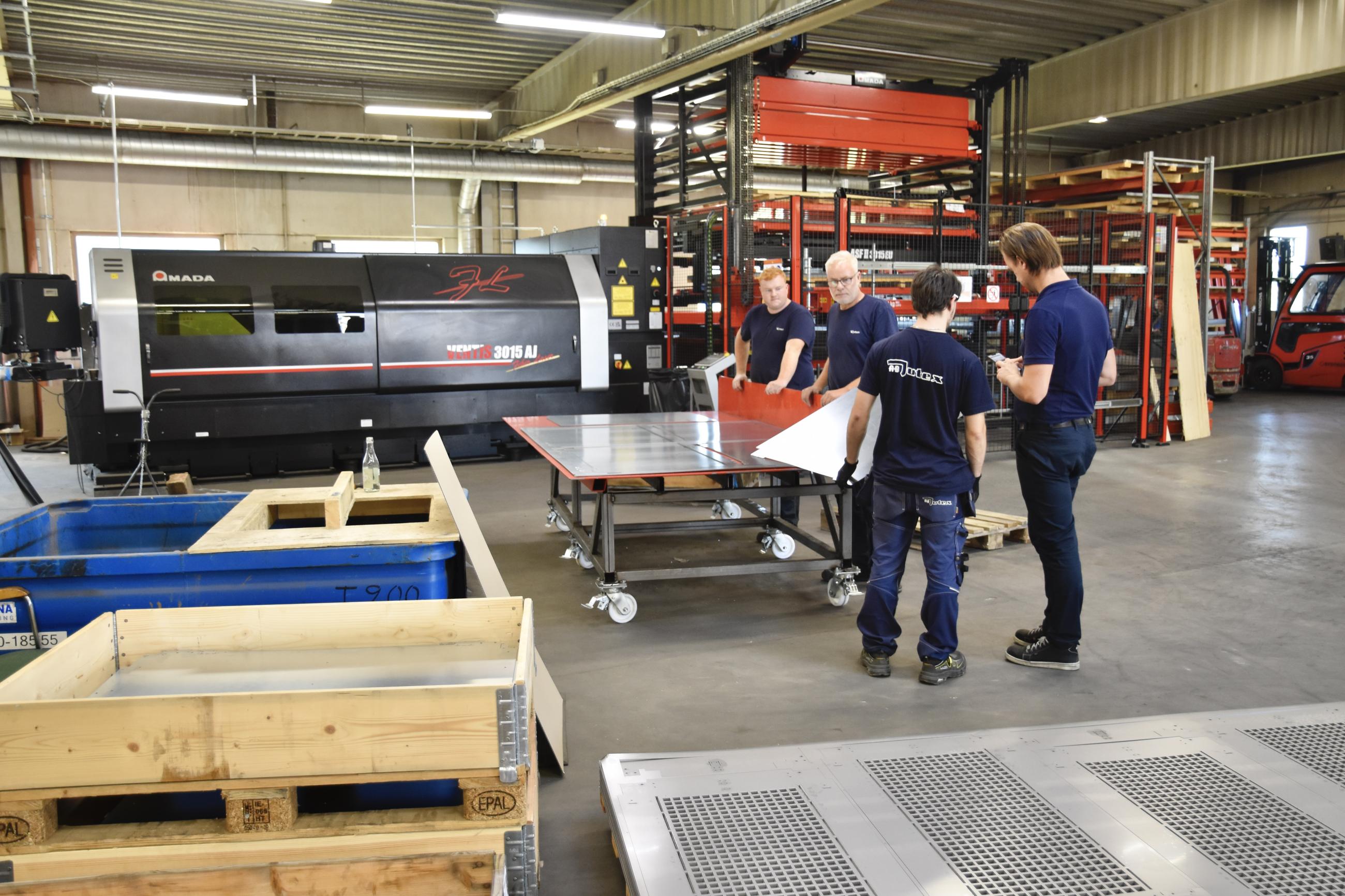 Samtidigt fortsätter också investeringarna i ny teknik. Fiberlasern från Amada med höglager producerar för fullt och en ny kantpress från Amada har nyligen kommit på plats. Det är den åttonde större maskininvesteringen de sista åren.