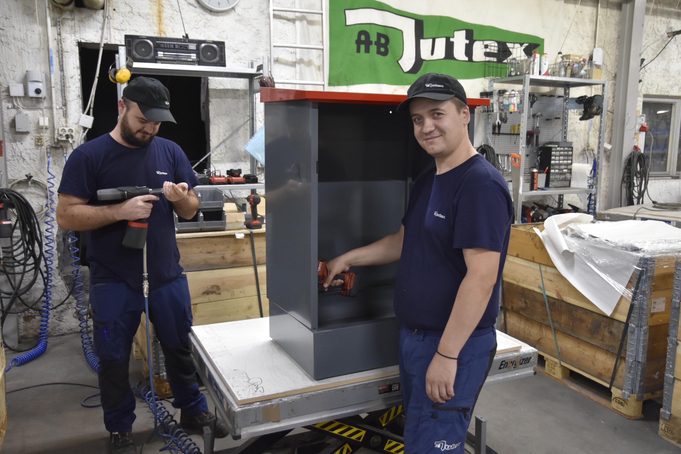 Montering pågår av ett skåp för insamling av farligt avfall – konstruerat och tillverkat från ax till limpa hos Jutex i Hillerstorp.