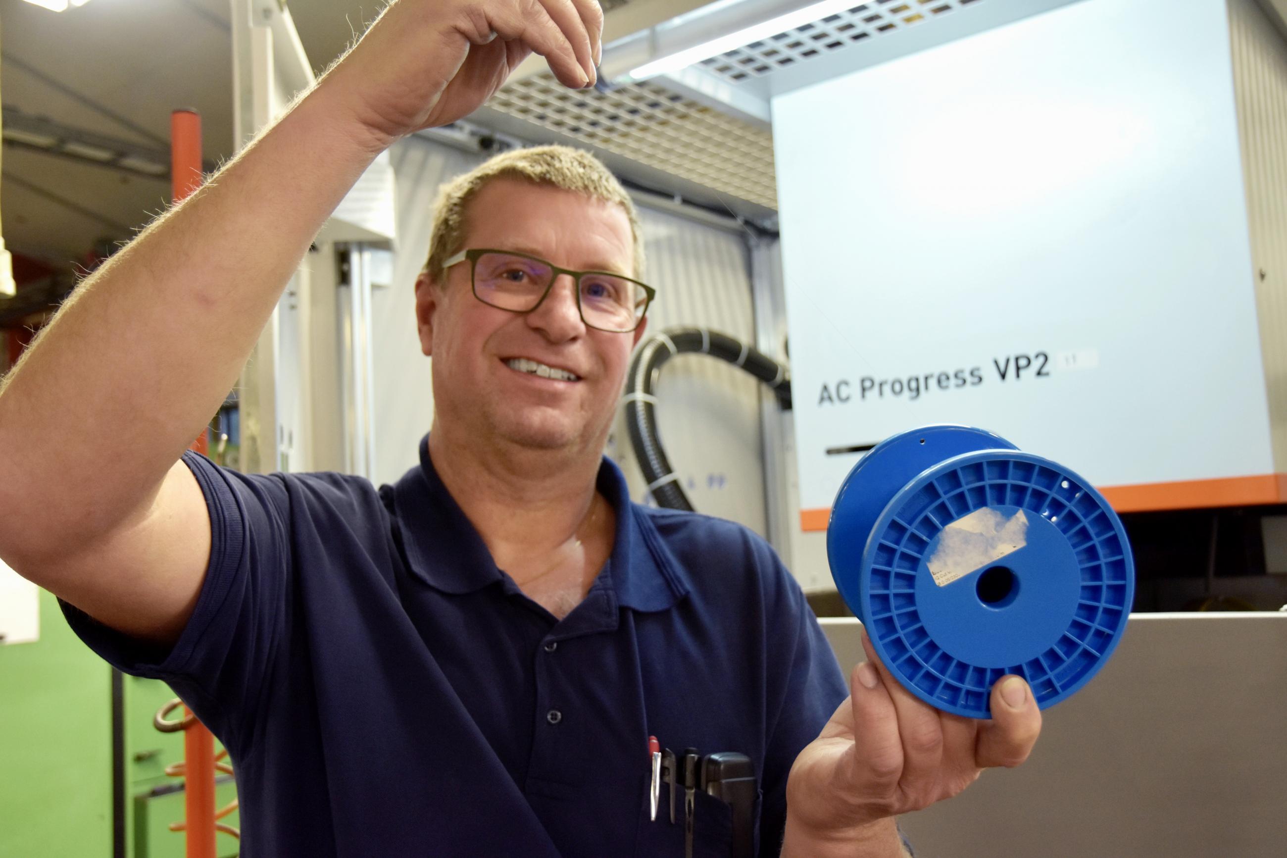 Ser du tråden? Fem hundradels millimeter, så tunn är tråden som används vid bearbetning i den senaste trådgnisten hos Miform, en Agie VP2.