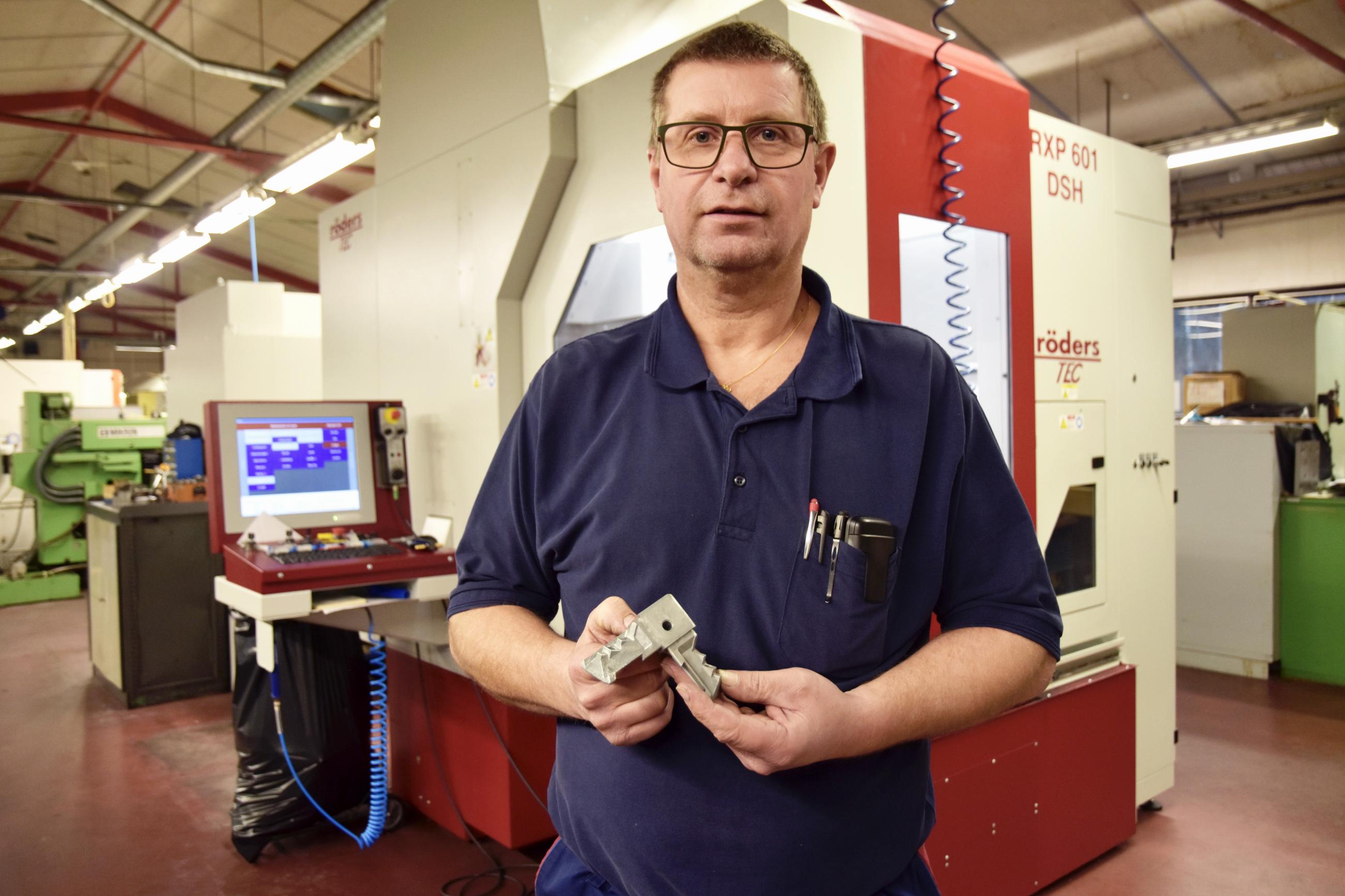 Zinkdetaljen är ett hörn till en ram i ett elskåp. ”Vi har precis fått tillverka ett nytt verktyg till en äldre detalj hos en av våra etablerade kunder”, berättar vd Bengt Svensson.