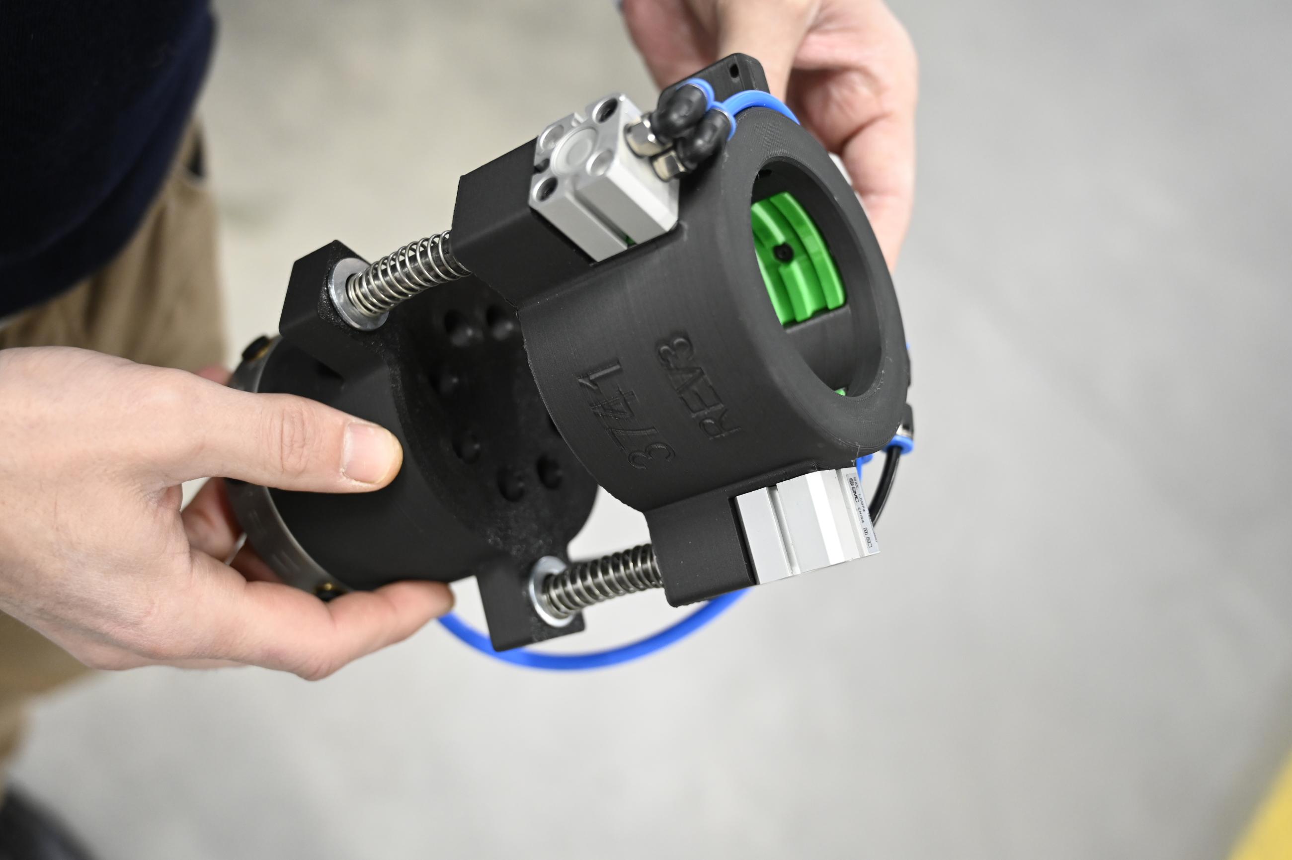 I stället för att fräsa detaljerna till gripdonet valde man 3D-print. ”Vi gör en stor besparing både i tid och pengar”, konstaterar Erik.