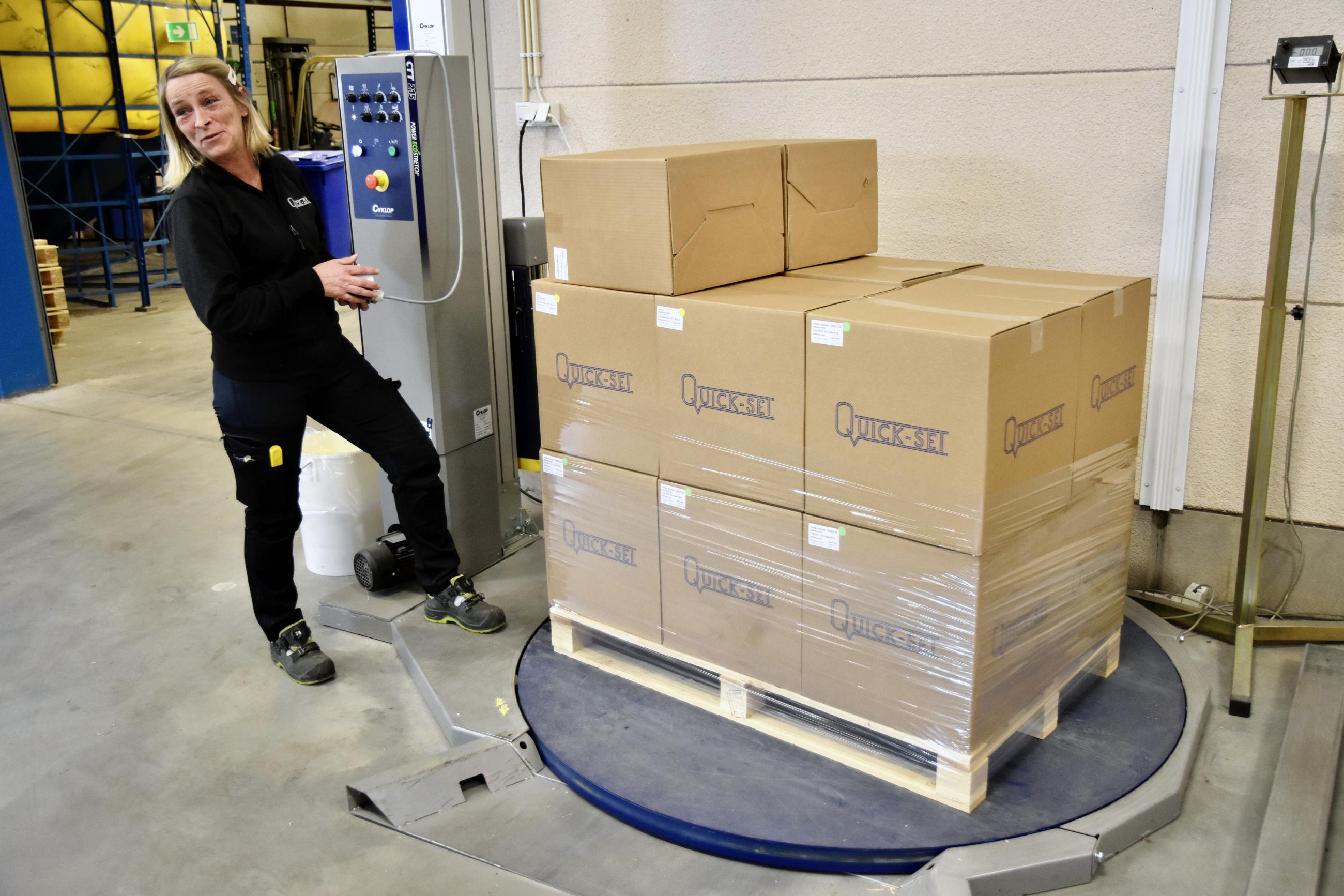 – Här står sändningar som ska till Kina, Indien, USA och Polen – och de här kartongerna går till Mexico, säger Anne Persson som precis försett en pall med sträckfilm inför transport.
