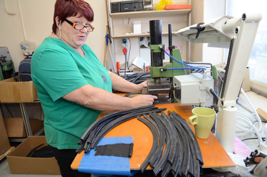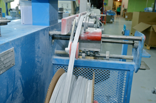 Silikongummit blandas i olika färg och hårdhetsgrad efter kundernas önskemål. Här matas dörrbladstätning ut från maskinen.
