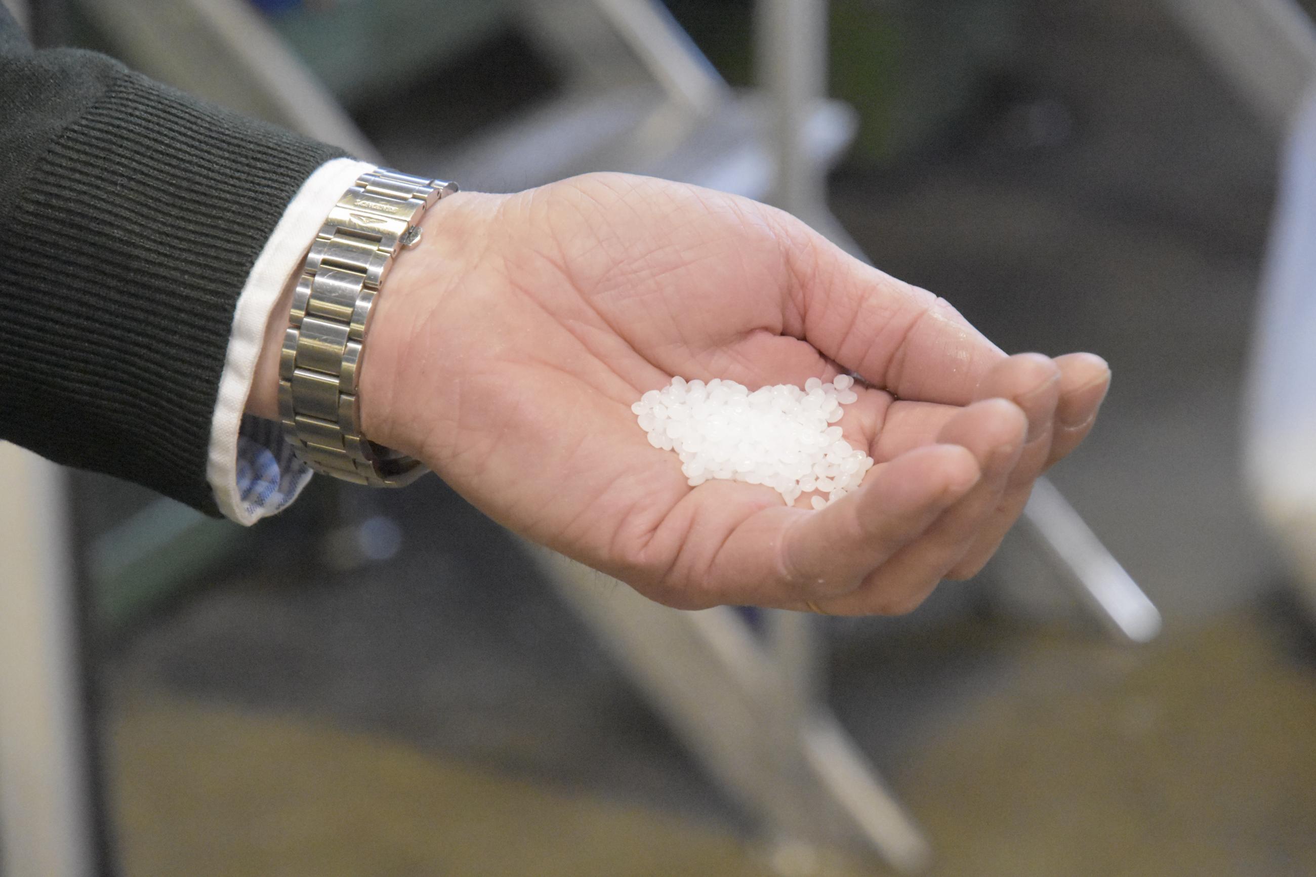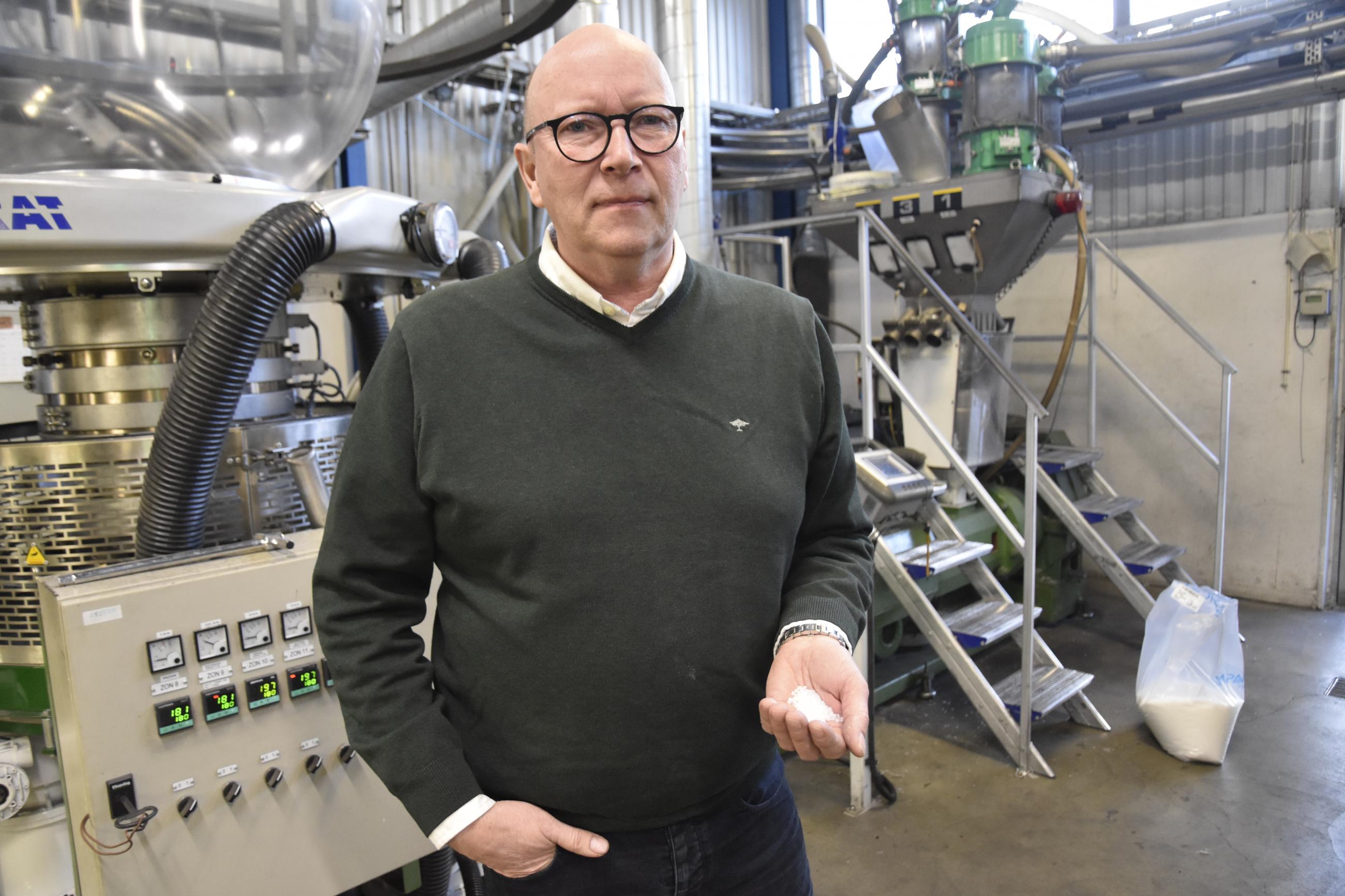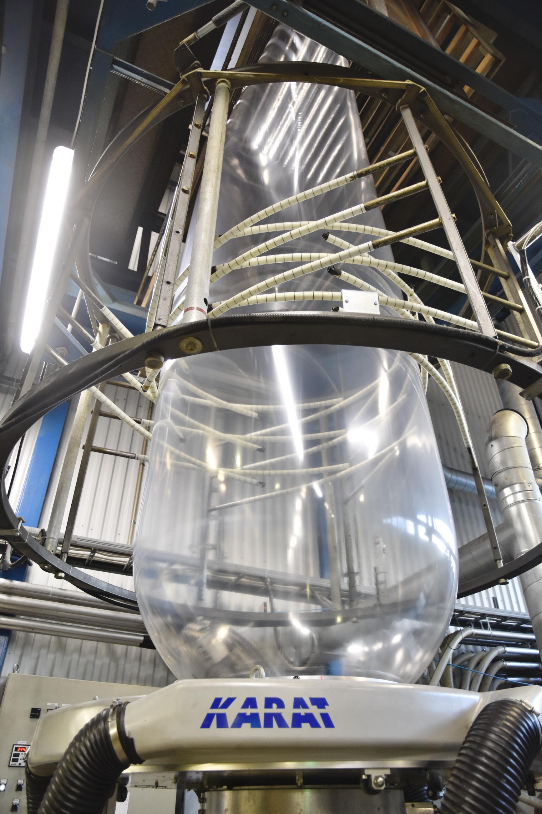 – Man behöver nästan se för att förstå, säger Magnus Fredriksson och visar vägen ut i produktionshallen där plastpellets matas in i maskiner som smälter kulorna och sedan blåser upp plasten till en ballongliknande tub, som sedan den svalnat rullas upp på rulle.