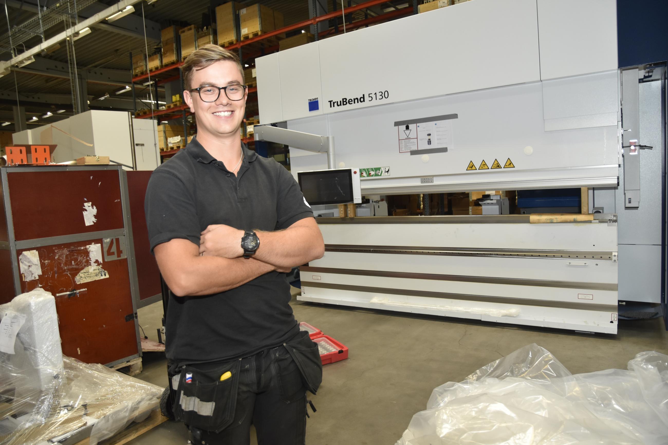 Under året har man investerat mer än 20 miljoner i tillbygge och ny utrustning. Produktionschef Viktor Thulin inspekterar installationen av senaste kantpressen.