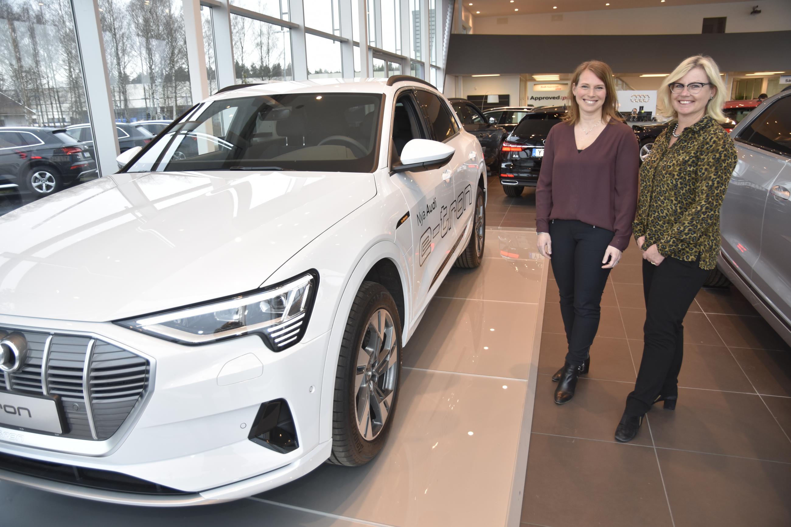 Framtiden är redan här. Styrelseordförande Anna Svenstig (tv) och vd Mim Andersson visar den första av Volkswagenkoncernens kommande elbilslanseringar: nya Audi e-tron, en stor SUV.