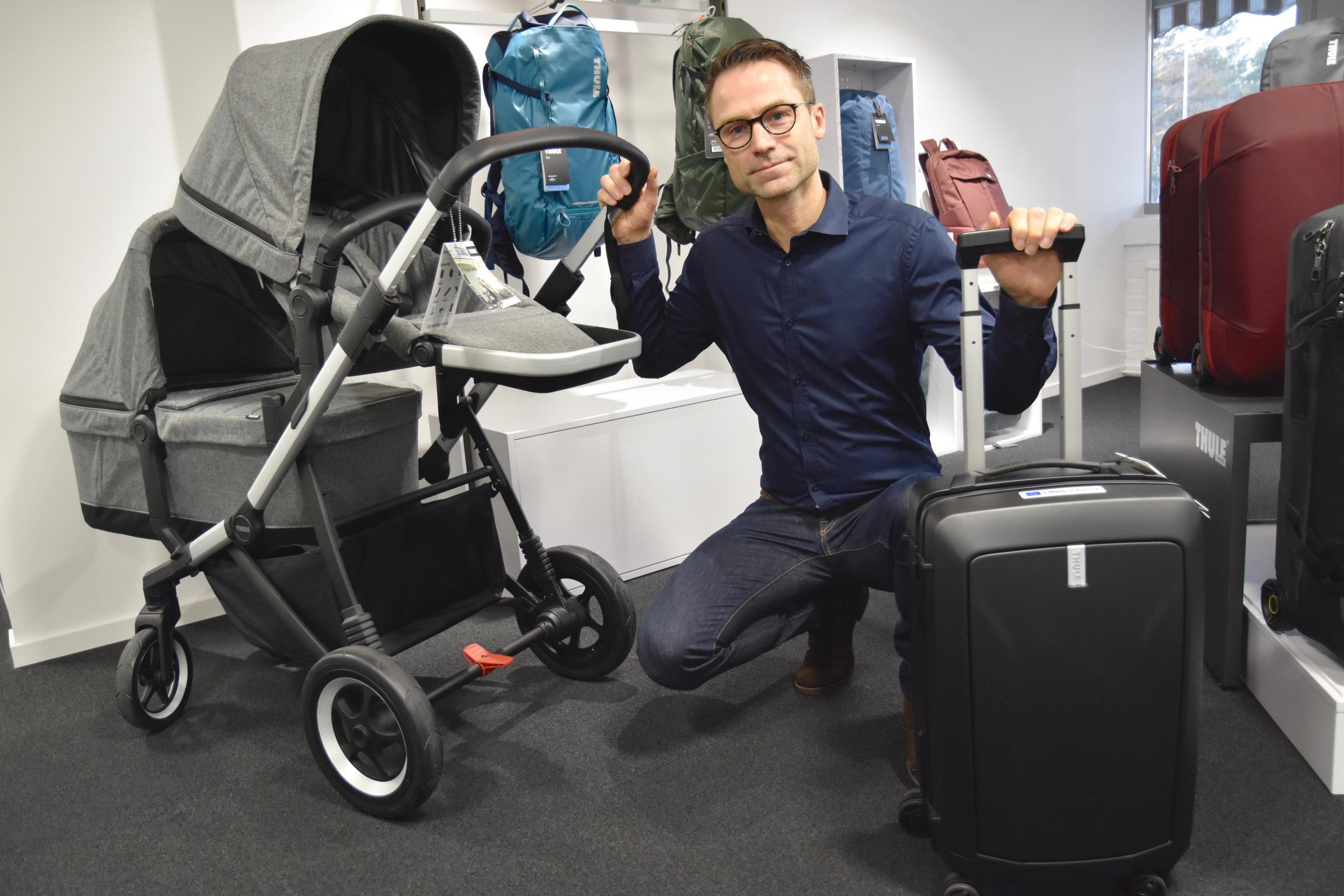 Mer än bara takräcken. Utvecklingschef Kalle Magnusson visar Thules allra första fyrhjuliga barnvagn, Thule Sleek, och den första hårda resväskan i den nya serien Thule Revolve.