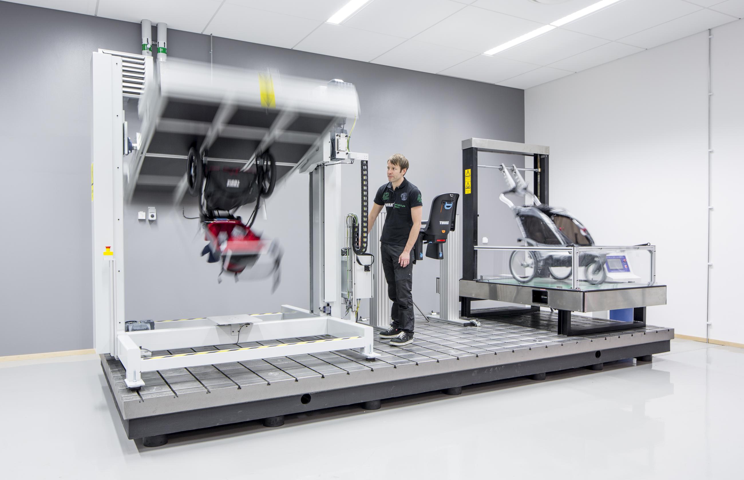 Här i Hillerstorp finns också testcentret som låter barnvagnarna rulla över 24 000 hinder med 44 kilos last och resväskorna utstå brutal hantering i en testtumlare. Hillerstorp rymmer även fabriken där man precis investerat 100 miljoner i maskinutrustning och automationslösningar för tillverkning av nyligen lanserade takräcken.