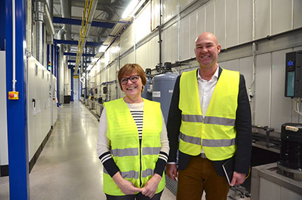 Den nya lackanläggningen är ett av många investerings-projekt i Troax verksamhet. Här är produktionschef Iréne Jansson och supply chain manager Christian Höglund intill den nya härdugnen (tv) och tvättanläggningen (th).